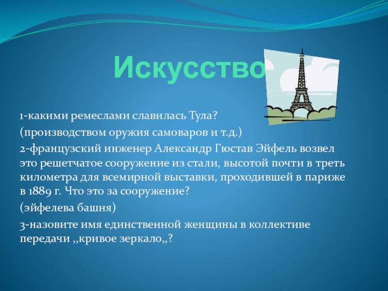 2-французский инженер Александр Гюстав Эйфель возвел это решетчатое сооружение из стали, высотой почти в треть километра для всемирной выставки, проходившей в париже в 1889 г. Что это за сооружение?