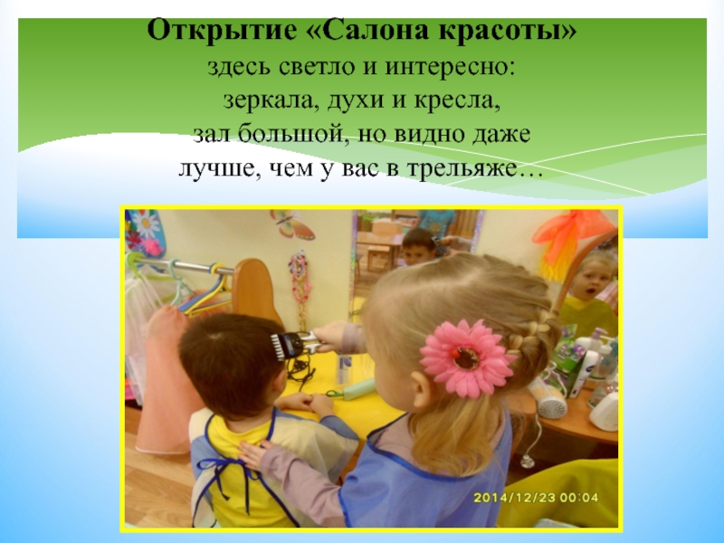 Распределение ролей: Парикмахер – ребенок, клиент – воспитатель, остальные дети занимают очередь, ждут, смотрят, рассматривают предложения и брошюры с прическами.