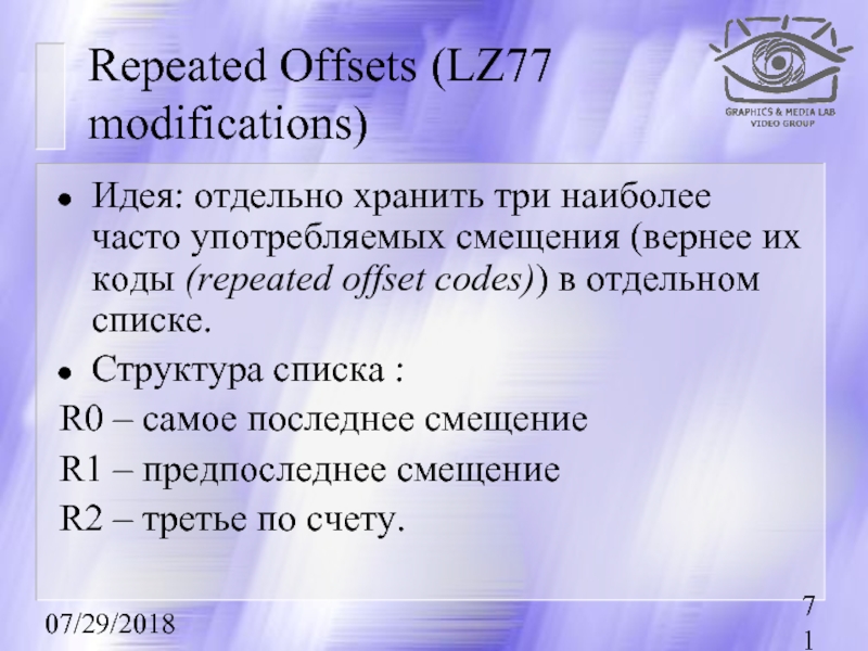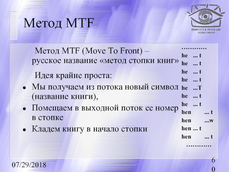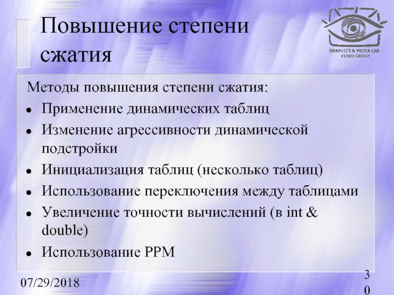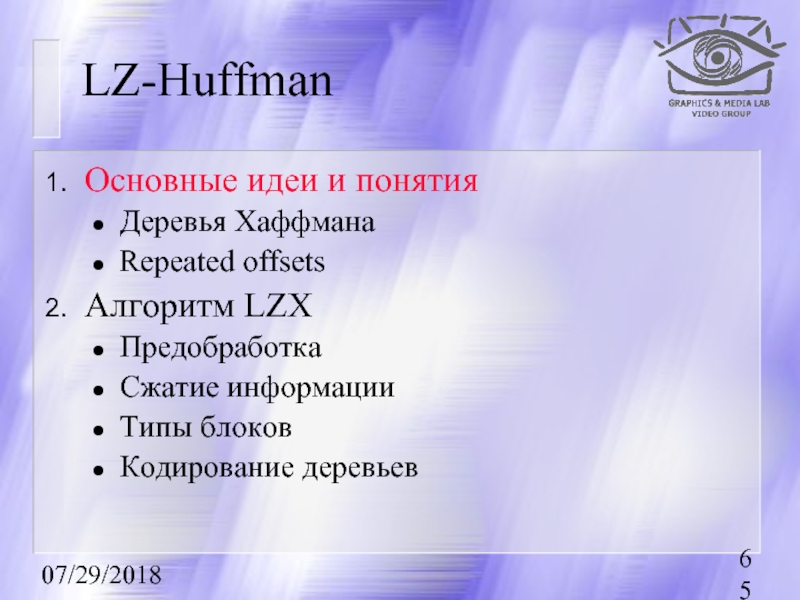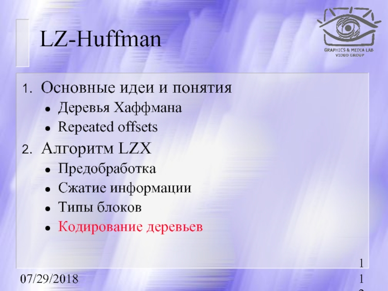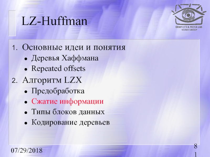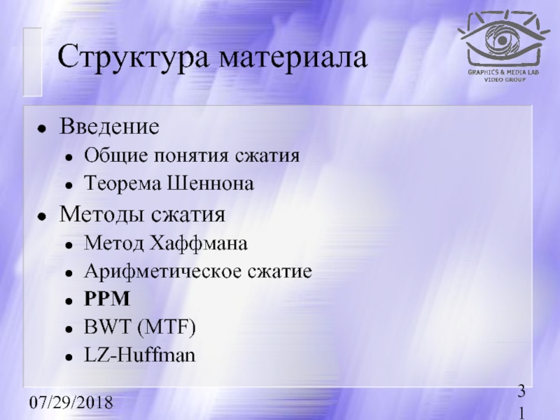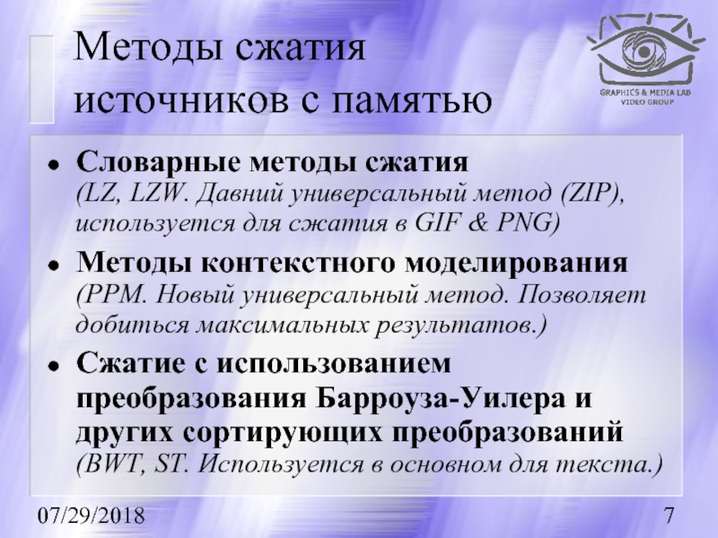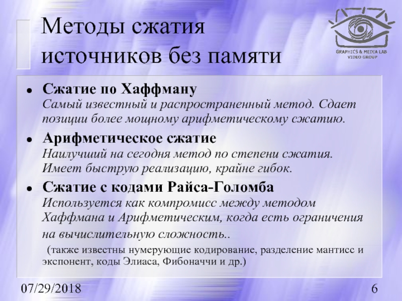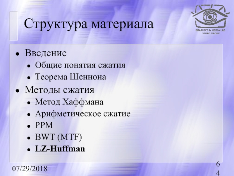 Первыми рассказываются методы сжатия без потерь, базовые для остальных методов.