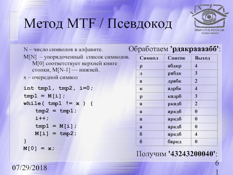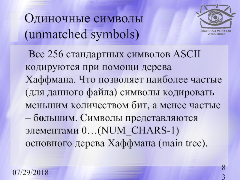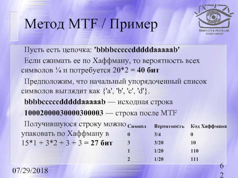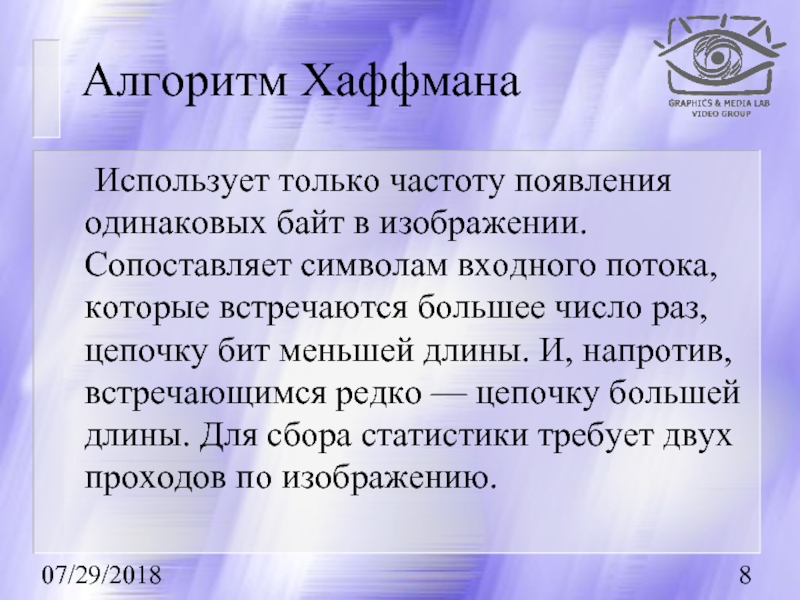 входного потока, которые встречаются большее число раз, цепочку бит меньшей длины. И, напротив, встречающимся редко — цепочку большей длины. Для сбора статистики требует двух проходов по изображению.