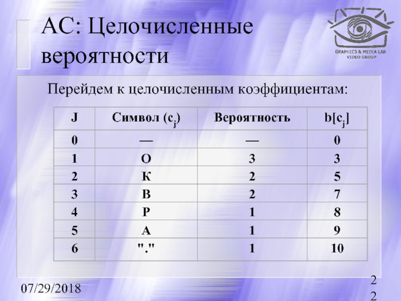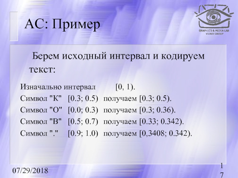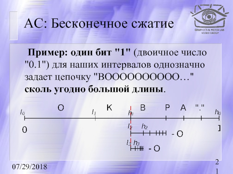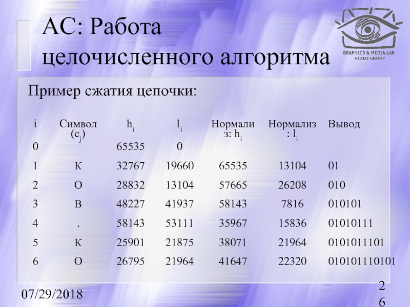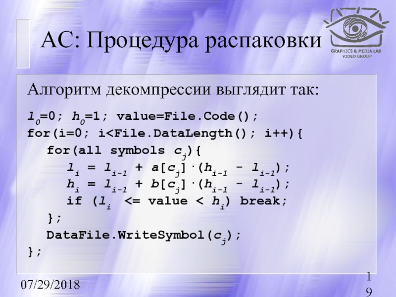 кодируемый интервал для i-го символа потока как [li, hi). То алгоритм компрессии запишется как: