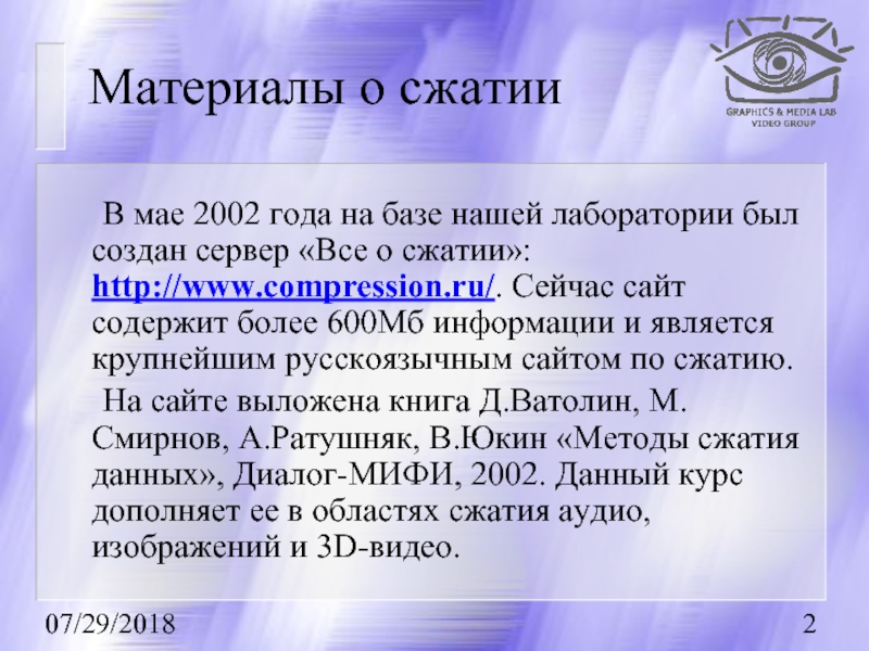 На сайте выложена книга Д.Ватолин, М.Смирнов, А.Ратушняк, В.Юкин «Методы сжатия данных», Диалог-МИФИ, 2002. Данный курс дополняет ее в областях сжатия аудио, изображений и 3D-видео.