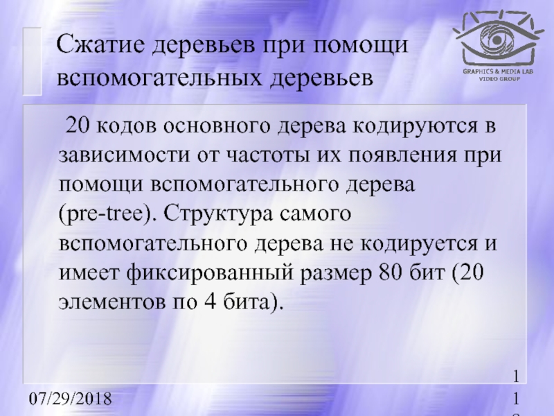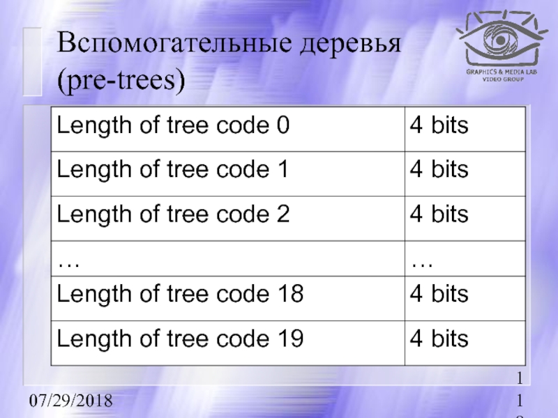 зависимости от частоты их появления при помощи вспомогательного дерева (pre-tree). Структура самого вспомогательного дерева не кодируется и имеет фиксированный размер 80 бит (20 элементов по 4 бита).