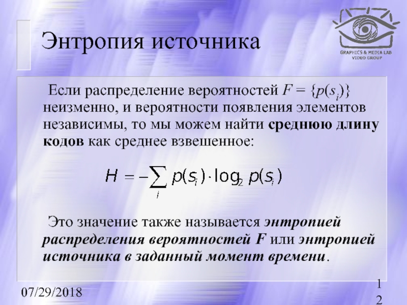 Это значение также называется энтропией распределения вероятностей F или энтропией источника в заданный момент времени.