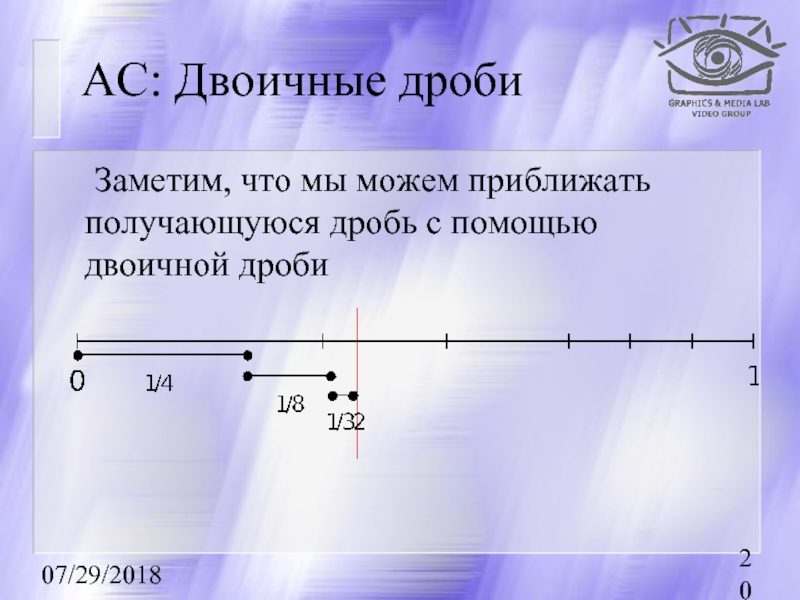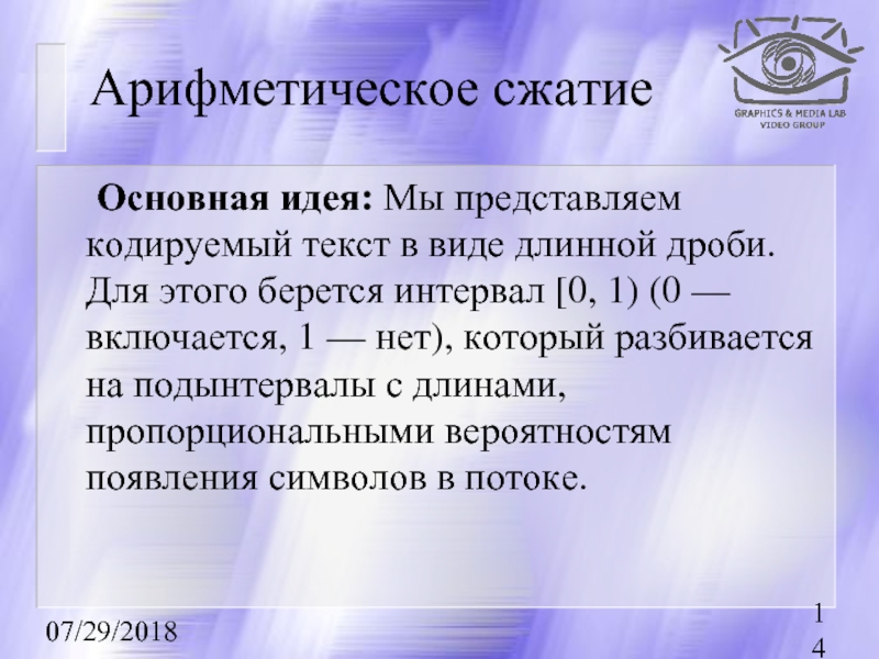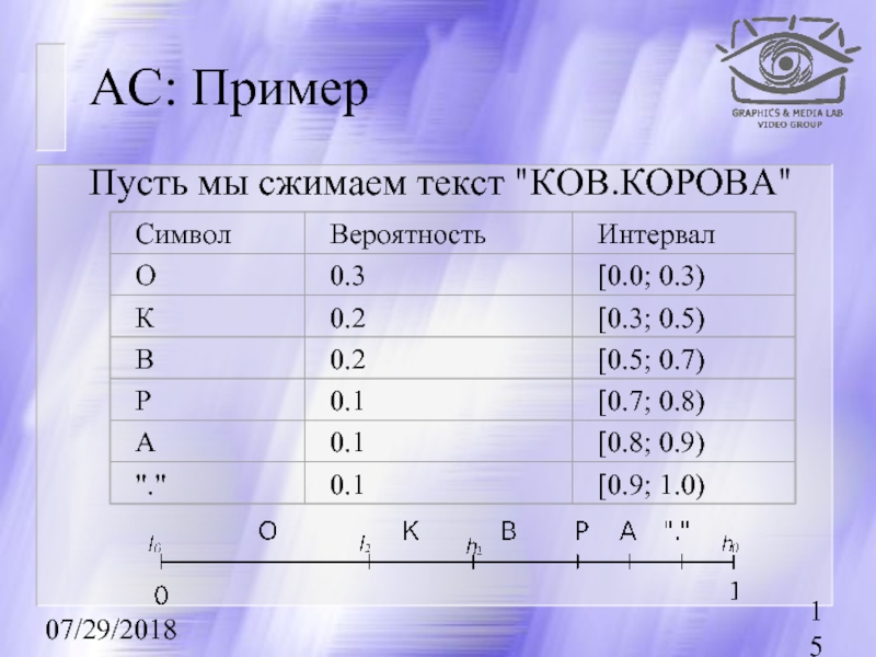 дроби. Для этого берется интервал [0, 1) (0 — включается, 1 — нет), который разбивается на подынтервалы с длинами, пропорциональными вероятностям появления символов в потоке.