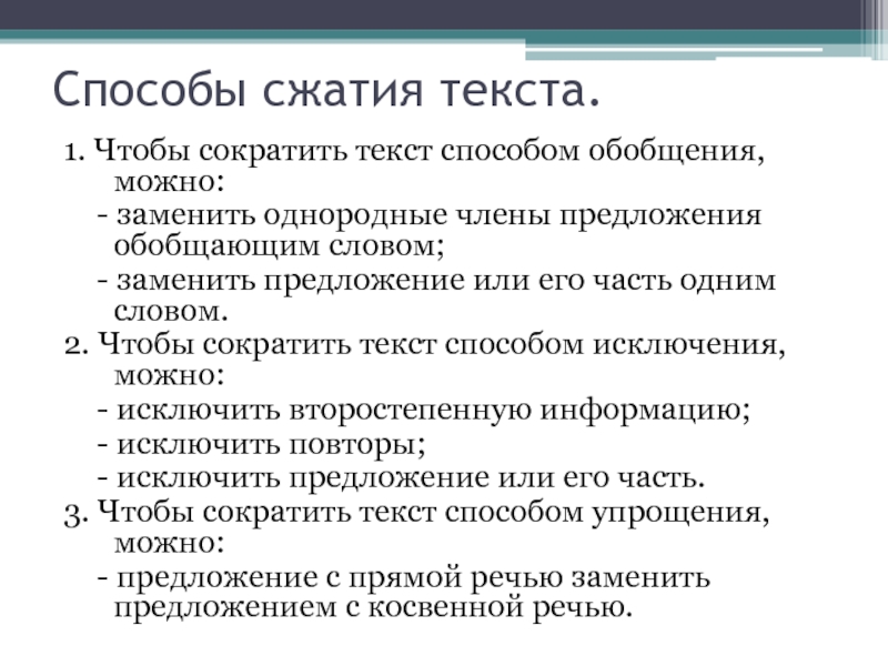 Слайд 5Способы сжатия текста.