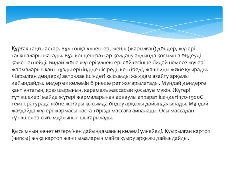 жатады. Бұл концентраттар қолдану алдында қосымша өңдеуді қажет етпейді. Бидай және жүгері үлпектері сәйкесінше бидай немесе жүгері жармаларын қант-тұзды ерітіндіде пісіреді, кептіреді, жаншиды және қуырады. Жарылған дәндерді автоклав ішіндегі қысымды жылдам азайту арқылы дайындайды. әндер өз көлемін бірнеше рет жоғарылатады. Мұндай дәндерге қант ұнтағын, қою шырынын, карамель массасын қосылуы мүкін. Жүгері түтікшелері майда жүгері жармаларынан арнаулы аппарат ішіндегі 170-1900С температурада және жоғары қысымда өңдеу арқылы дайындалынады. Мұндай жағдайда жүгері жармасы паста тәрізді массаға айналады. Осы массадан түтікшелер сығымдалынып шығарылады.