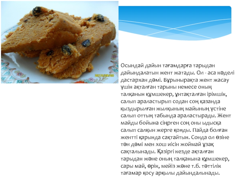 Слайд 7Осындай дайын тағамдарға тарыдан дайындалатын жент жатады. Ол - аса кәделі