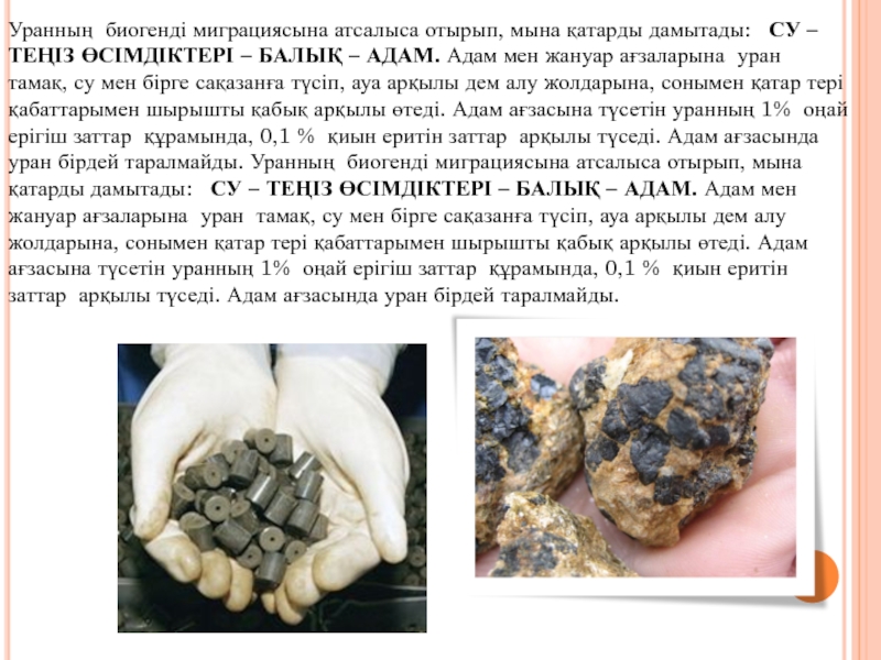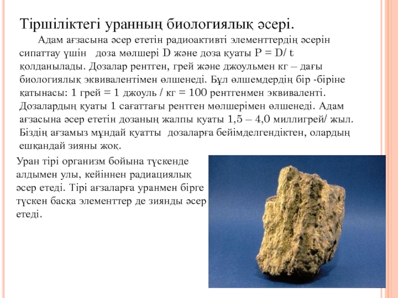 Уран тірі организм бойына түскенде алдымен улы, кейіннен радиациялық әсер етеді. Тірі ағзаларға уранмен бірге түскен басқа элементтер де зиянды әсер етеді.