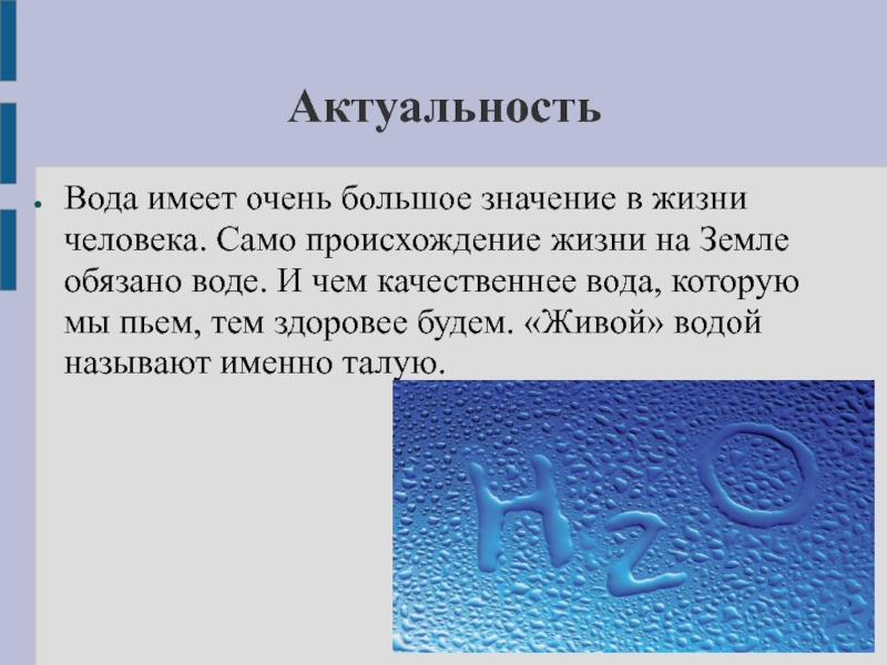 Вода имеет очень большое значение в жизни человека. Само происхождение жизни
