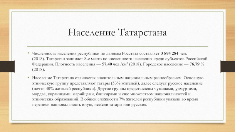 Численность населения республики по данным Росстата составляет 3 894 284 чел. (2018). Татарстан занимает 8-е место