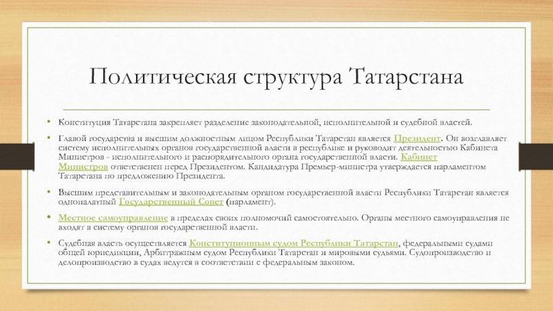 Конституция Татарстана закрепляет разделение законодательной, исполнительной и судебной властей.