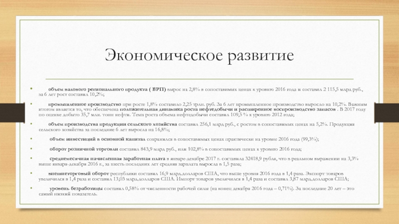 промышленное производство при росте 1,8% составило 2,25 трлн. руб. За 6 лет промышленное производство выросло на 10,2%. Важным итогом является то, что обеспечена положительная динамика роста нефтедобычи и расширенное воспроизводство запасов . В 2017 году по оценке добыто 35,7 млн. тонн нефти. Темп роста объема нефтедобычи составил 109,5 % к уровню 2012 года;
