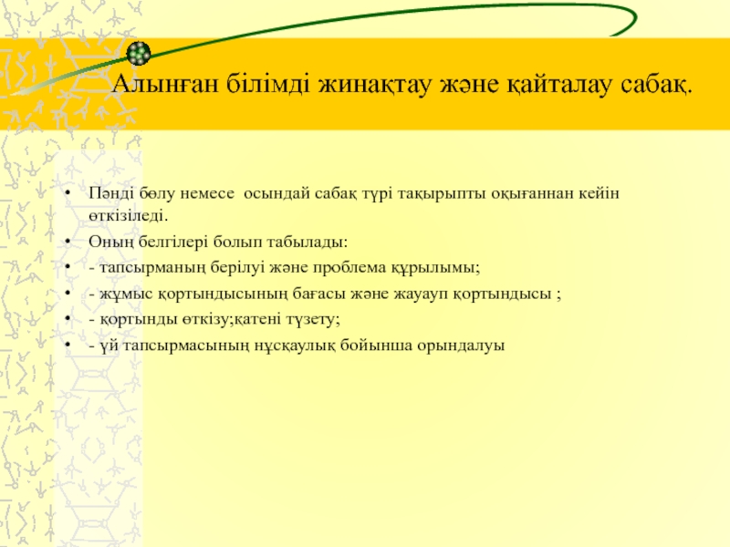 Слайд 13Алынған білімді жинақтау және қайталау сабақ.