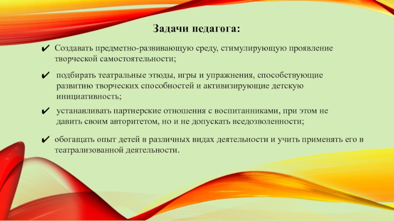 Создавать предметно-развивающую среду, стимулирующую проявление творческой самостоятельности;