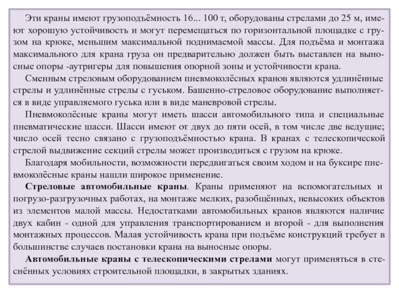 м, име-ют хорошую устойчивость и могут перемещаться по горизонтальной площадке с гру-зом на крюке, меньшим максимальной поднимаемой массы. Для подъёма и монтажа максимального для крана груза он предварительно должен быть выставлен на выно-сные опоры -аутригеры для повышения опорной зоны и устойчивости крана.
