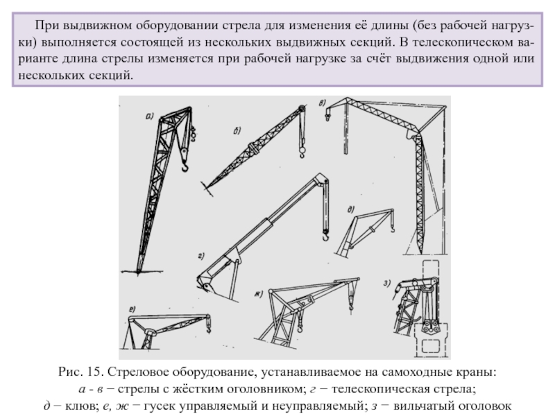 Слайд 28Рис. 15. Стреловое оборудование, устанавливаемое на самоходные краны: