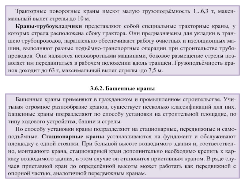 Тракторные краны применяют при выполнении специальных видов работ, связан-ных с перемещением в условиях бездорожья. Краны подразделяют на поворотные и краны-трубоукладчики. Их монтируют на серийных гусеничных тракторах.