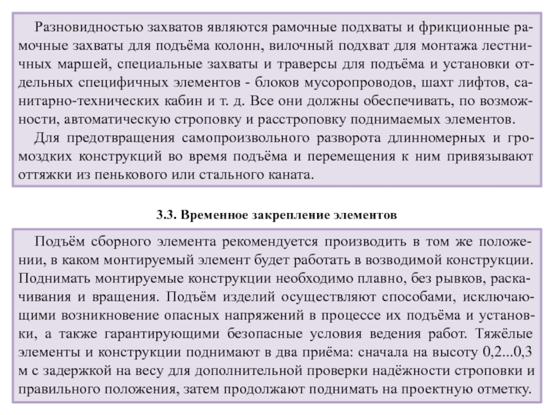 Подъём сборного элемента рекомендуется производить в том же положе-нии, в каком монтируемый элемент будет работать в возводимой конструкции. Поднимать монтируемые конструкции необходимо плавно, без рывков, раска-чивания и вращения. Подъём изделий осуществляют способами, исключаю-щими возникновение опасных напряжений в процессе их подъёма и установ-ки, а также гарантирующими безопасные условия ведения работ. Тяжёлые элементы и конструкции поднимают в два приёма: сначала на высоту 0,2...0,3 м с задержкой на весу для дополнительной проверки надёжности строповки и правильного положения, затем продолжают поднимать на проектную отметку.