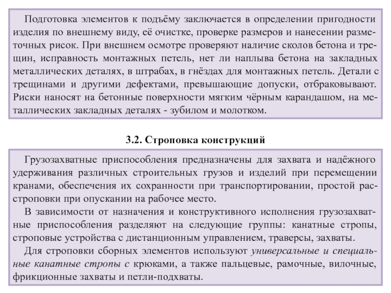 Грузозахватные приспособления предназначены для захвата и надёжного удерживания различных строительных грузов и изделий при перемещении кранами, обеспечения их сохранности при транспортировании, простой рас-строповки при опускании на рабочее место.