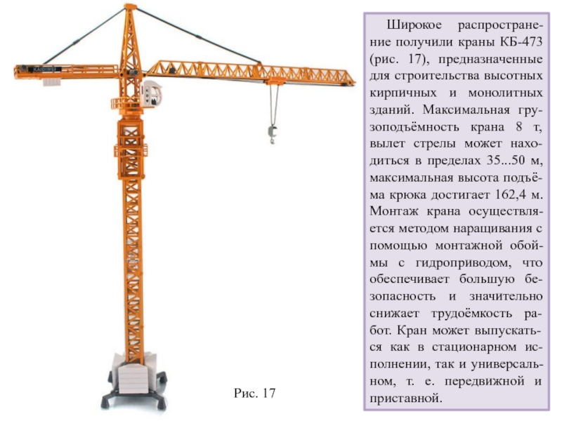 Широкое распростране-ние получили краны КБ-473 (рис. 17), предназначенные для строительства