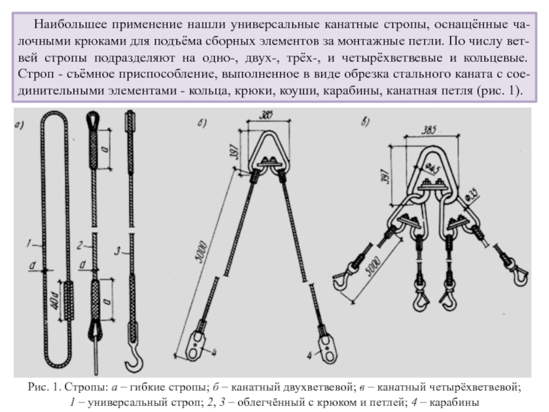 1 – универсальный строп; 2, 3 – облегчённый с крюком и петлей; 4 – карабины