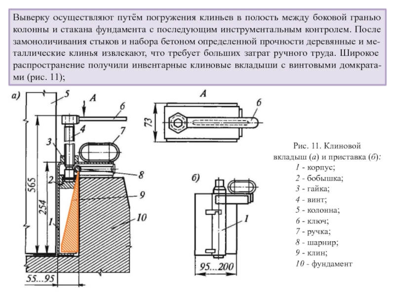 и устройства. Они могут быть индивидуальны-ми и групповыми. К индивидуальным средствам относятся клинья, расчалки (рис. 8, а), подкосы (рис. 8, б), распорки, кондукторы (рис. 9), фиксаторы и т. п.