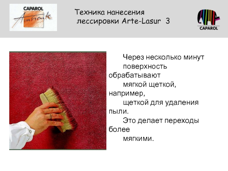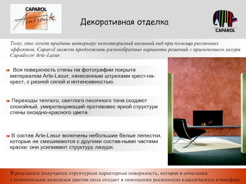 Тому, кто хочет придать интерьеру неповторимый внешний вид при помощи различных эффектов, Caparol может предложить разнообразные варианты решений с применением лазури Capadecor Arte-Lasur.