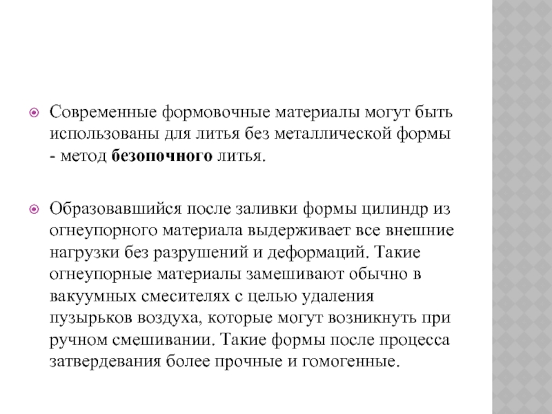 Образовавшийся после заливки формы цилиндр из огнеупорного материала выдерживает все внешние нагрузки без разрушений и деформаций. Такие огнеупорные материалы замешивают обычно в вакуумных смесителях с целью удаления пузырьков воздуха, которые могут возникнуть при ручном смешивании. Такие формы после процесса затвердевания более прочные и гомогенные.