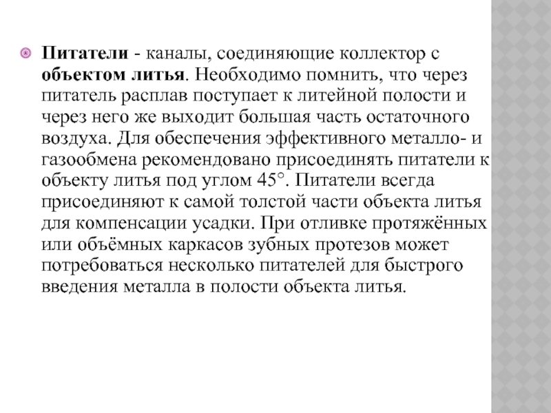 через питатель расплав поступает к литейной полости и через него же выходит большая часть остаточного воздуха. Для обеспечения эффективного металло- и газообмена рекомендовано присоединять питатели к объекту литья под углом 45°. Питатели всегда присоединяют к самой толстой части объекта литья для компенсации усадки. При отливке протяжённых или объёмных каркасов зубных протезов может потребоваться несколько питателей для быстрого введения металла в полости объекта литья.