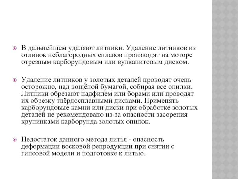 Удаление литников у золотых деталей проводят очень осторожно, над вощёной бумагой, собирая все опилки. Литники обрезают надфилем или борами или проводят их обрезку твёрдосплавными дисками. Применять карборундовые камни или диски при обработке золотых деталей не рекомендовано из-за опасности засорения крупинками карборунда золотых опилок.