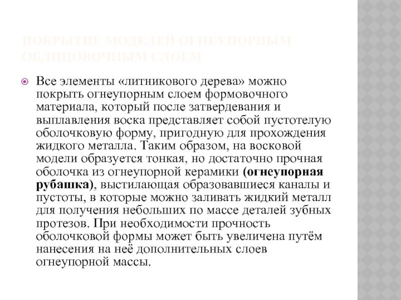 слоем формовочного материала, который после затвердевания и выплавления воска представляет собой пустотелую оболочковую форму, пригодную для прохождения жидкого металла. Таким образом, на восковой модели образуется тонкая, но достаточно прочная оболочка из огнеупорной керамики (огнеупорная рубашка), выстилающая образовавшиеся каналы и пустоты, в которые можно заливать жидкий металл для получения небольших по массе деталей зубных протезов. При необходимости прочность оболочковой формы может быть увеличена путём нанесения на неё дополнительных слоев огнеупорной массы.