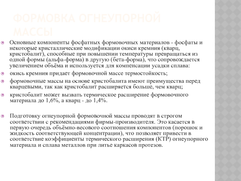 Подготовку огнеупорной формовочной массы проводят в строгом соответствии с рекомендациями фирмы-производителя. Это касается в первую очередь объёмно-весового соотношения компонентов (порошок и жидкость соответствующей концентрации), что позволяет привести в соответствие коэффициенты термического расширения (КТР) огнеупорного материала и сплава металлов при литье каркасов протезов.