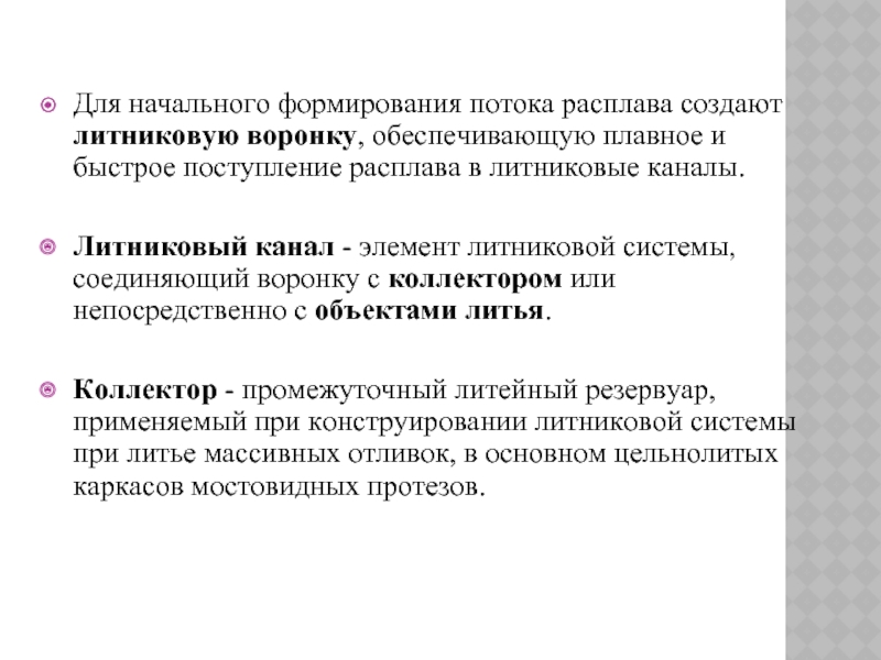 Коллектор - промежуточный литейный резервуар, применяемый при конструировании литниковой системы при литье массивных отливок, в основном цельнолитых каркасов мостовидных протезов.
