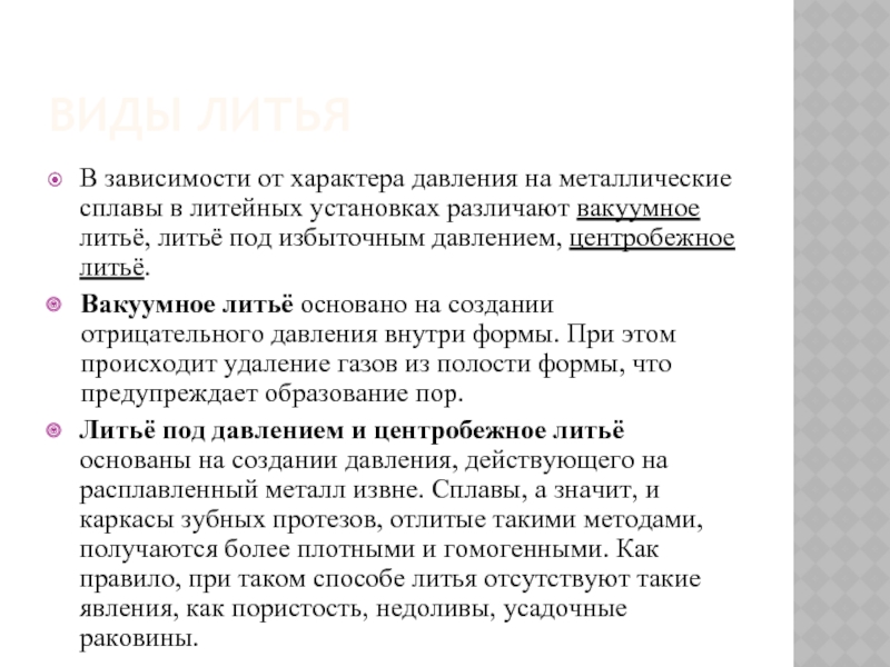 Литьё под давлением и центробежное литьё основаны на создании давления, действующего на расплавленный металл извне. Сплавы, а значит, и каркасы зубных протезов, отлитые такими методами, получаются более плотными и гомогенными. Как правило, при таком способе литья отсутствуют такие явления, как пористость, недоливы, усадочные раковины.