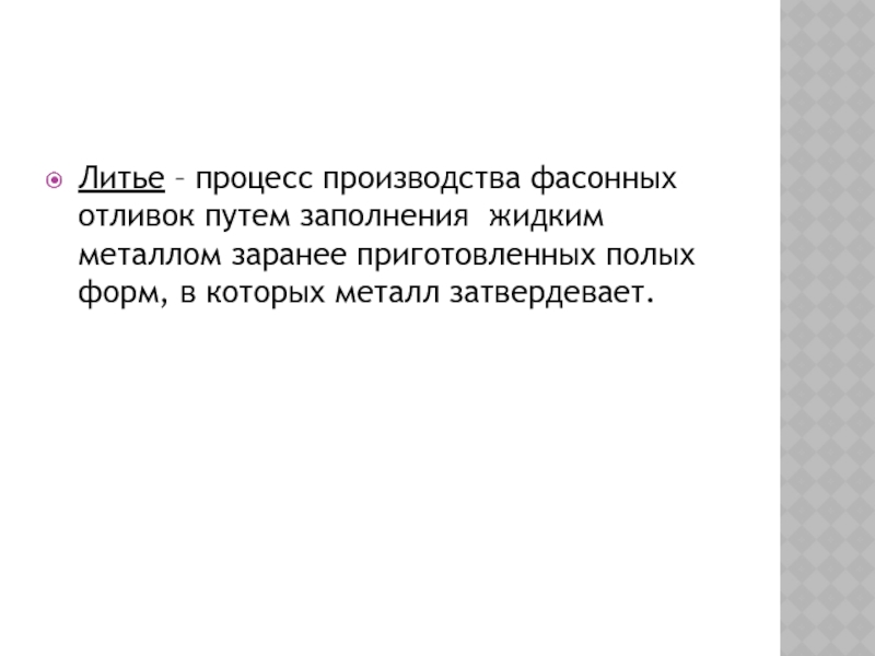 Слайд 2Литье – процесс производства фасонных отливок путем заполнения жидким металлом заранее