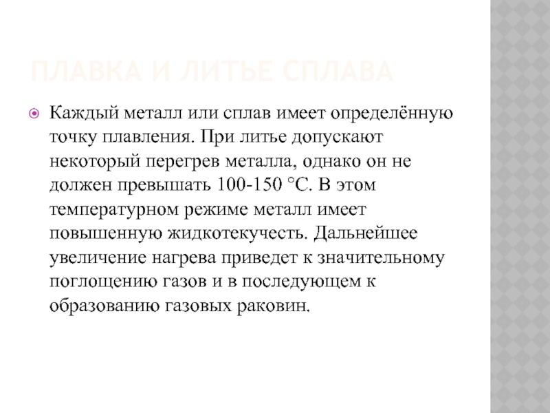 При литье допускают некоторый перегрев металла, однако он не должен превышать 100-150 °С. В этом температурном режиме металл имеет повышенную жидкотекучесть. Дальнейшее увеличение нагрева приведет к значительному поглощению газов и в последующем к образованию газовых раковин.