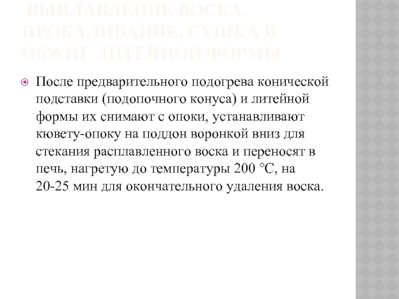 конической подставки (подопочного конуса) и литейной формы их снимают с опоки, устанавливают кювету-опоку на поддон воронкой вниз для стекания расплавленного воска и переносят в печь, нагретую до температуры 200 °С, на 20-25 мин для окончательного удаления воска.