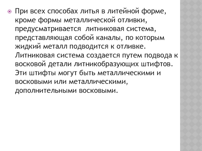 предусматривается литниковая система, представляющая собой каналы, по которым жидкий металл подводится к отливке. Литниковая система создается путем подвода к восковой детали литникобразующих штифтов. Эти штифты могут быть металлическими и восковыми или металлическими, дополнительными восковыми.