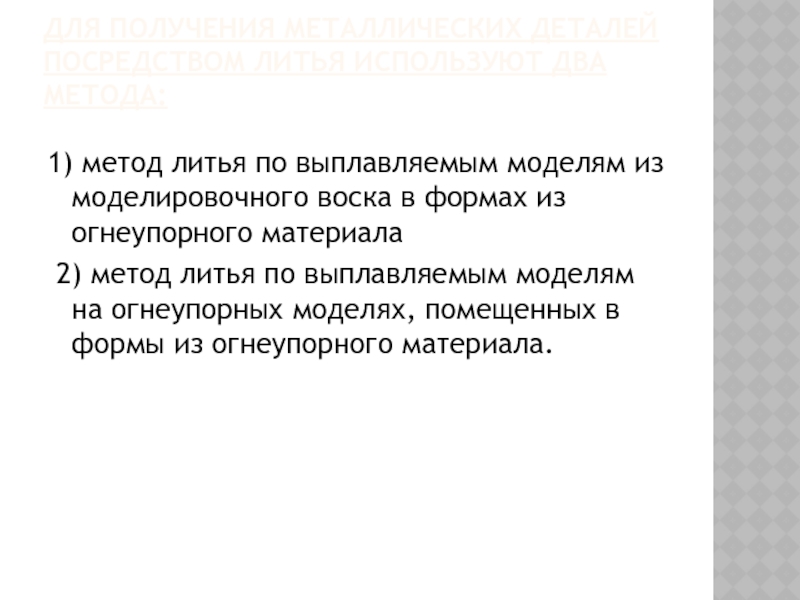 Слайд 3ДЛЯ ПОЛУЧЕНИЯ МЕТАЛЛИЧЕСКИХ ДЕТАЛЕЙ ПОСРЕДСТВОМ ЛИТЬЯ ИСПОЛЬЗУЮТ ДВА МЕТОДА: