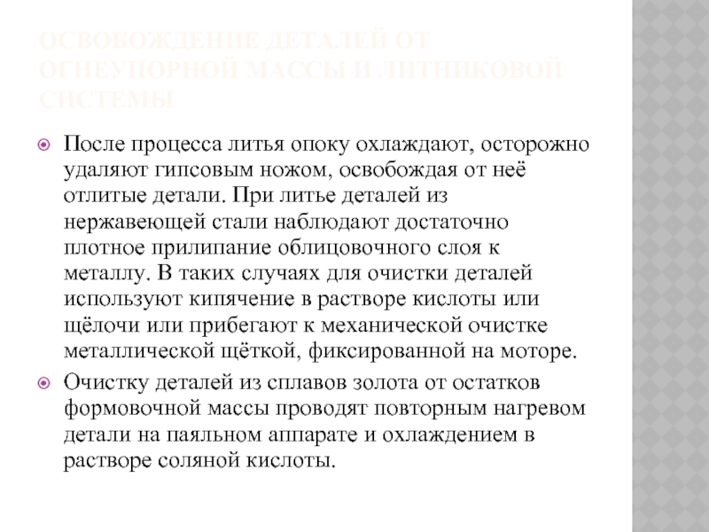 Слайд 24ОСВОБОЖДЕНИЕ ДЕТАЛЕЙ ОТ ОГНЕУПОРНОЙ МАССЫ И ЛИТНИКОВОЙ СИСТЕМЫ