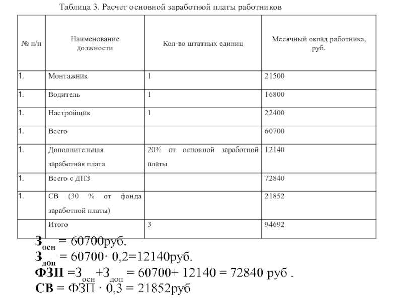Таблица 3. Расчет основной заработной платы работников