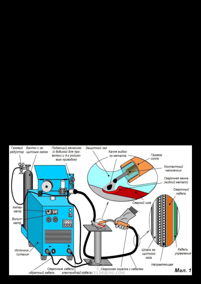 в тому, що електрична дуга горить в середовищі активного газу який володіє окислювальними властивостями. Вуглекислий газ витісняє з зони дуги повітря, хоча сам здійснює на метал окислювальний вплив за рахунок утворення атомарного кисню. Метал шва надійно захищається від азоту і кисню повітря, но атомарний кисень, що виділяється при розпаді вуглекислого газу, окислює метал. Для нейтралізації окислювальної дії вуглекислого газу при зварюванні вуглецевих і низьколегованих сталей використовують зварювальний дріт з підвищеним вмістом мангану і силіцію (Св-08ГСА, Св-08Г2СА).Зварювання у вуглекислому газі здійснюють плавким електродом переважно напівавтоматичним способом. Живлять зварювальну дугу від джерела постійного струму із жорсткою або зростальною зовнішньою характеристикою при зворотній полярності. Зварювання у вуглекислому газі характеризується високою продуктивністю і низькою вартістю, внаслідок чого цей спосіб дедалі більше поширюється для зварювання маловуглецевих, низьколегованих і деяких високолегованих сталей. Вуглекислий газ для потреб зварювання добувають з відхідних газів хімічних виробництв. Поставляють його у зрідженому стані в сталевих балонах місткістю 40 л, в яких під тиском 7,5 МПа міститься 25 л рідкої вуглекислоти. При випаровуванні її утворюється 12750 л вуглекислого газу.До основних параметрів режиму зварювання в захисних газах ставляться: