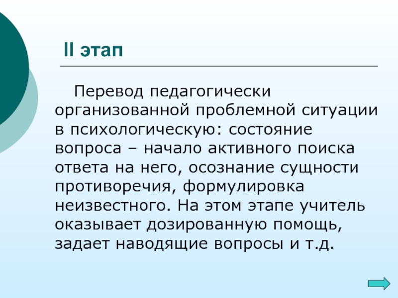 состояние вопроса – начало активного поиска ответа на него, осознание сущности противоречия, формулировка неизвестного. На этом этапе учитель оказывает дозированную помощь, задает наводящие вопросы и т.д.