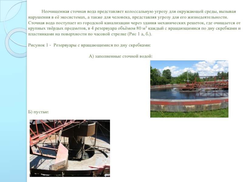 для окружающей среды, вызывая нарушения в её экосистемах, а также для человека, представляя угрозу для его жизнедеятельности. Сточная вода поступает из городской канализации через здания механических решеток, где очищается от крупных твёрдых предметов, в 4 резервуара объёмом 80 м3 каждый с вращающимися по дну скребками и пластинками на поверхности по часовой стрелке (Рис 1 а, б.).