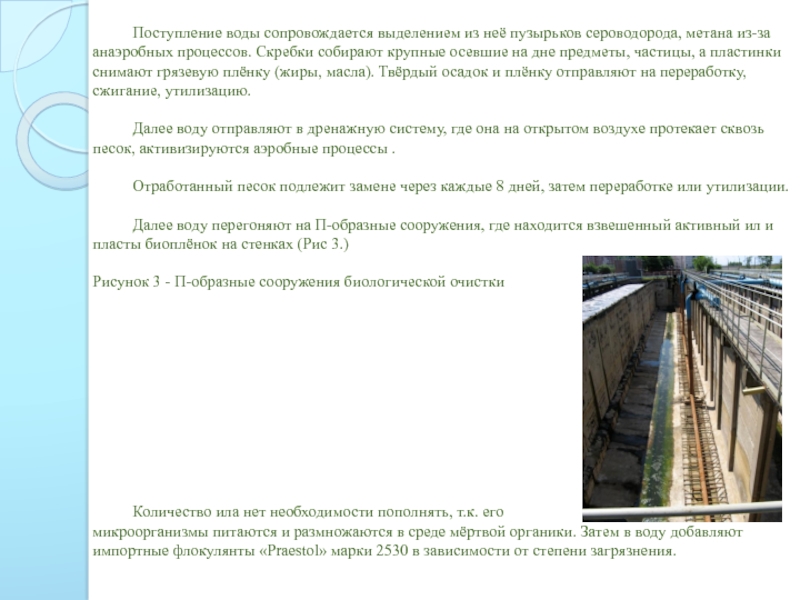 микроорганизмы питаются и размножаются в среде мёртвой органики. Затем в воду добавляют импортные флокулянты «Praestol» марки 2530 в зависимости от степени загрязнения.
