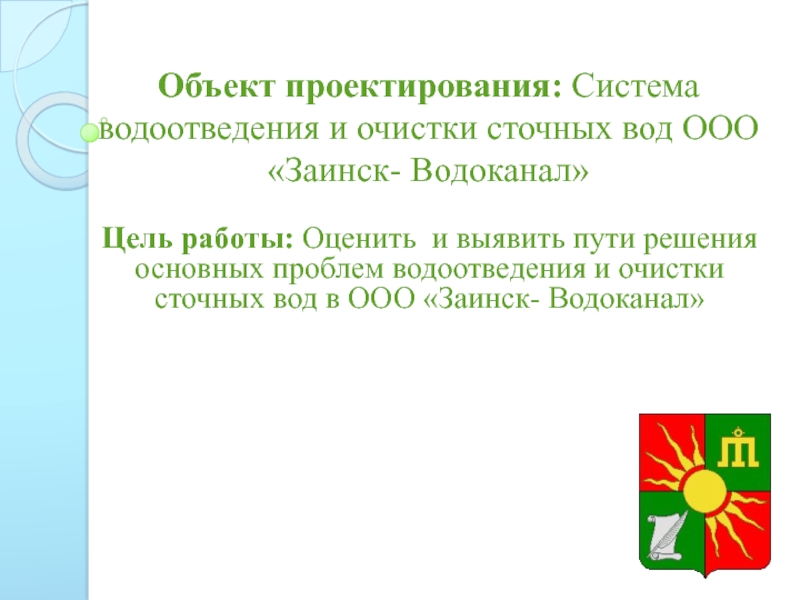 Слайд 2Объект проектирования: Система водоотведения и очистки сточных вод ООО «Заинск- Водоканал»