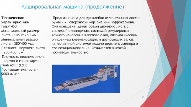 Предназначена для приклейки отпечатанных листов бумаги к поверхности картона или гофрокартона. Она оснащена: детекторами двойного листа с системой оповещения, системой регулировки точного нанесения клеевого слоя, автоматическим очищением клеенаносящих и дозирующих валов, качественной системой подачи верхнего лайнера и его позиционирования. Отличается высокой производительностью.