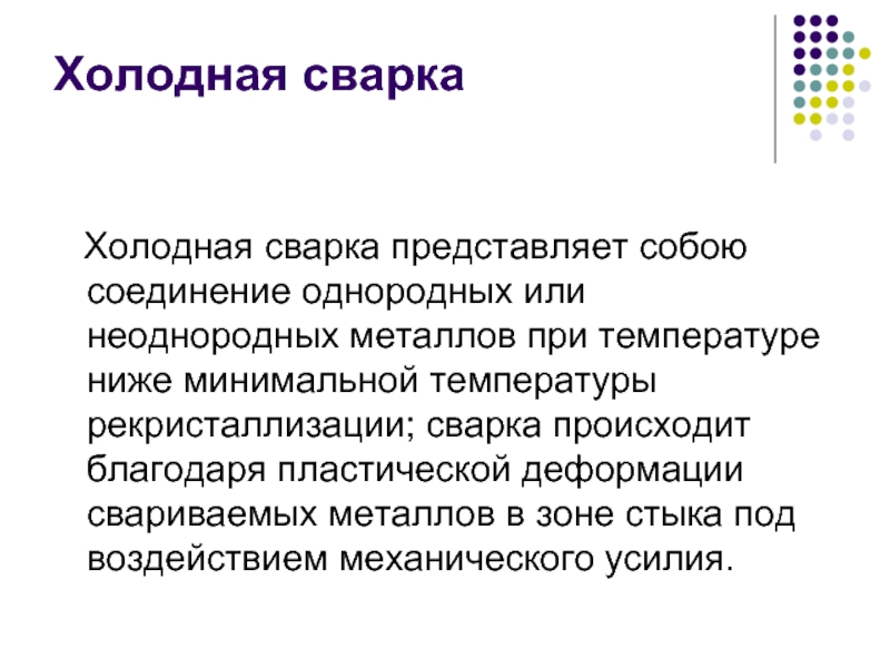 металлов при температуре ниже минимальной температуры рекристаллизации; сварка происходит благодаря пластической деформации свариваемых металлов в зоне стыка под воздействием механического усилия.