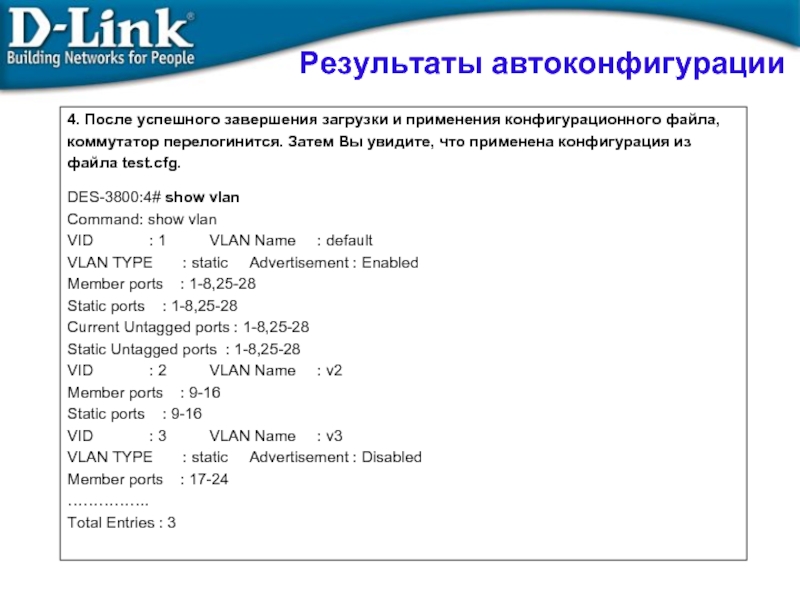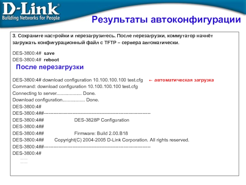 DES-3800:4# download configuration 10.100.100.100 test.cfg  ← автоматическая загрузка